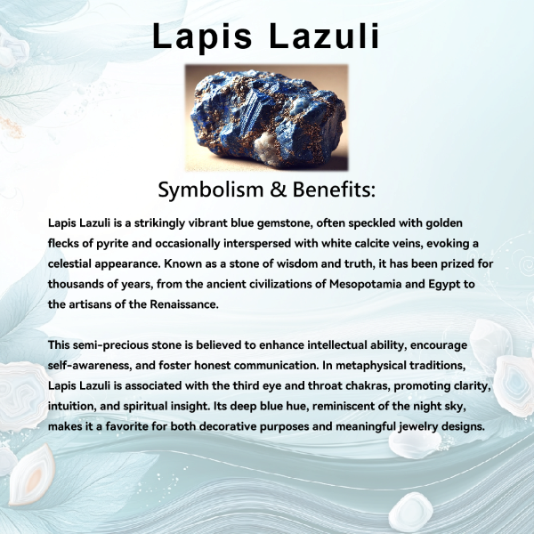 A stunning piece of natural jewelry that blends timeless design with the rich beauty of lapis lazuli. Known for its deep blue hue and golden flecks, lapis lazuli symbolizes wisdom, truth, and inner peace, making it more than just a gemstone.