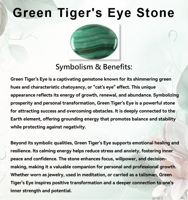 Green Tiger's Eye is a stone of growth, prosperity, and protection, known for its vibrant green hues and dynamic energy. It symbolizes renewal, abundance, and good fortune, making it an ideal stone for those seeking to attract success and financial stability. This stone enhances personal strength, willpower, and resilience, helping its wearer overcome challenges and stay focused on their goals. Green Tiger's Eye also promotes emotional balance and harmony, reducing stress and anxiety while fostering confidence. With its grounding and protective qualities, it encourages positive transformation, healing, and a deep connection to one's inner power and potential.