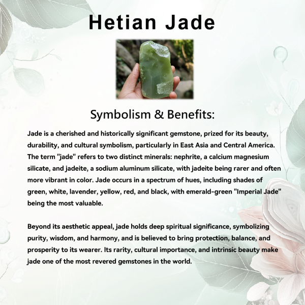 Beyond its symbolism, Hetian jade is celebrated for its metaphysical benefits. It is believed to promote physical well-being by balancing the body's energy and fostering a sense of calm and tranquility. This stone is also thought to strengthen personal resilience, encouraging confidence and clarity in decision-making. As a protective stone, Hetian jade is said to guard against negative influences, providing a soothing energy that nurtures emotional stability and inner peace. Whether worn for its beauty or its deeper meaning, Hetian jade continues to inspire awe and reverence in every form.