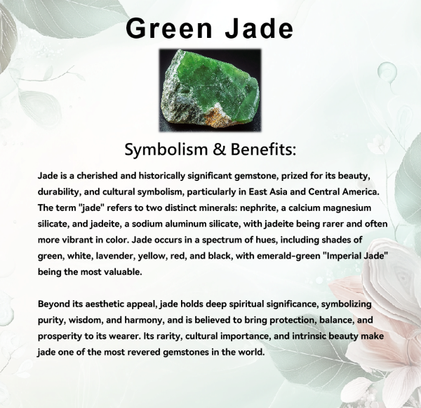 Green jade symbolizes harmony, purity, and wisdom, reflecting a deep connection to nature and balance. Revered as a stone of good fortune and prosperity, it is believed to attract success, abundance, and luck. Spiritually, green jade is associated with emotional healing, promoting serenity, and encouraging personal growth. Often considered a protective stone, it guards against negative energy while fostering confidence, compassion, and inner peace.