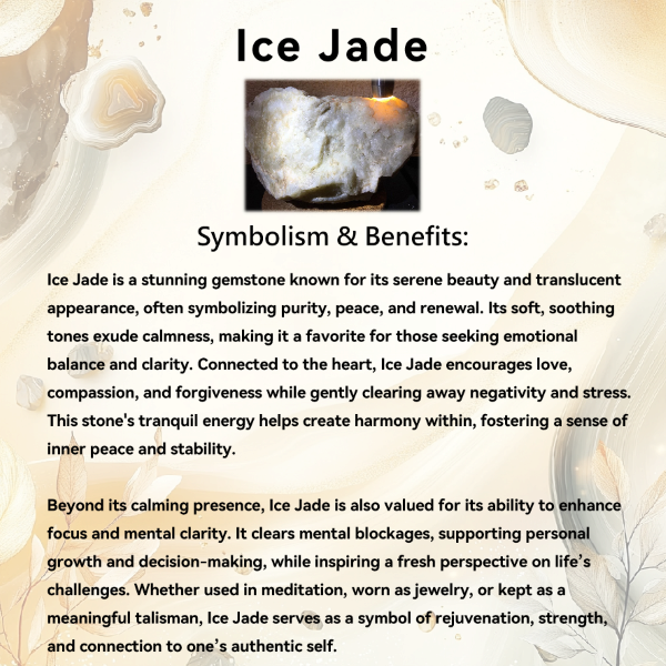 Ice Jade is a symbol of purity, serenity, and renewal, celebrated for its calming energy and elegant translucence. This stone is believed to bring harmony to the mind, body, and spirit, promoting inner peace and emotional balance. Known for its connection to the heart, Ice Jade encourages compassion, love, and forgiveness while dispelling negative thoughts and stress. It is also associated with clarity and focus, helping to clear mental blockages and support personal growth. As a stone of gentle strength, Ice Jade inspires tranquility, rejuvenation, and a deeper connection to one's true self, making it a powerful companion for healing and transformation.